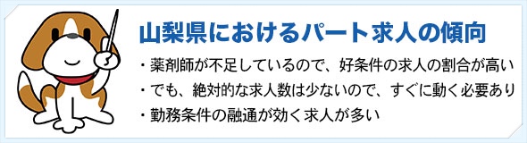 これは、47都道府県中34位となる数字ですが、山梨は薬剤師が慢性的に不足しているため、募集する側も、人材確保に苦戦しています。そういった背景から、どの地域であれ、薬剤師を急募している店舗が多いのが実情です。